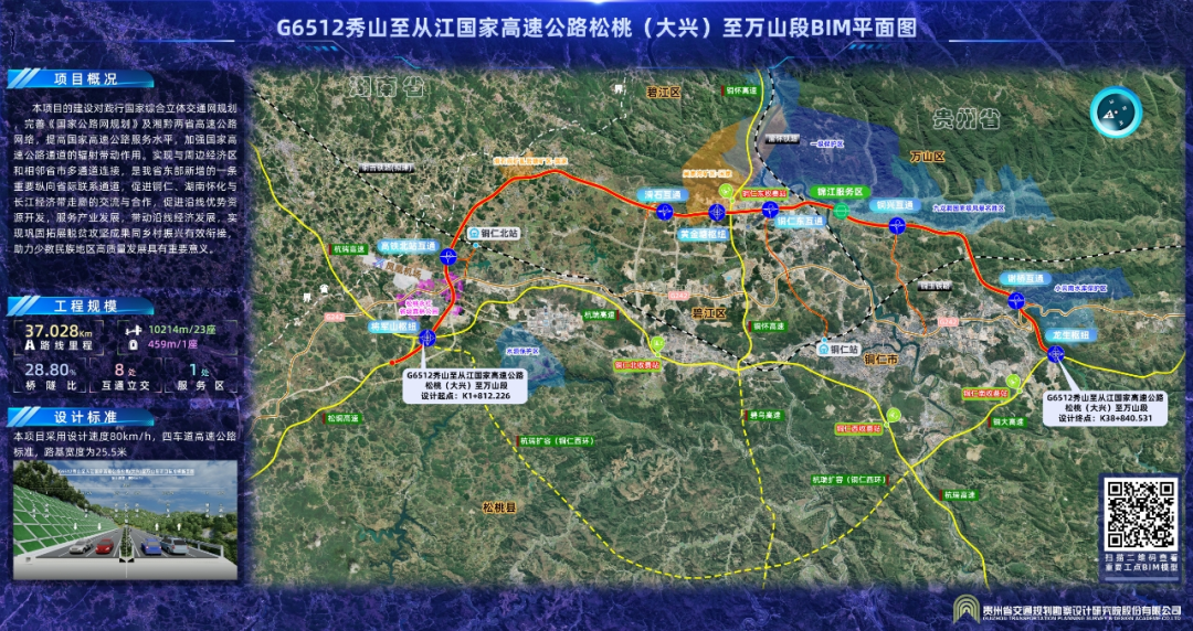 贵州交投集团投资建设的松万项目起于松桃县大兴街道,顺接松铜高速通过改造将军山枢纽与杭瑞高速十字交叉,终点在万山区龙生,设“T型枢纽”与铜大高速衔接,路线全长36.982公里,全线采用4车道高速公路标准建设,设计速度80公里/小时。