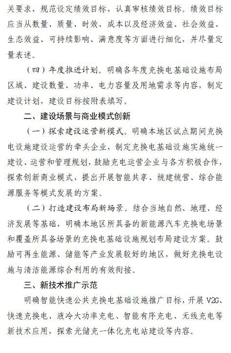 (三)积极培育新技术新模式在农村地区的推广应用。充分结合本地区场景应用条件,积极探索车网互动(V2G)、快速充换电、液冷大功率充电、智能有序充电、无线充电等新技术新模式应用。分布式光伏覆盖较好的农村地区,可结合实际建设光伏发电、储能、充换电一体化的充电基础设施。