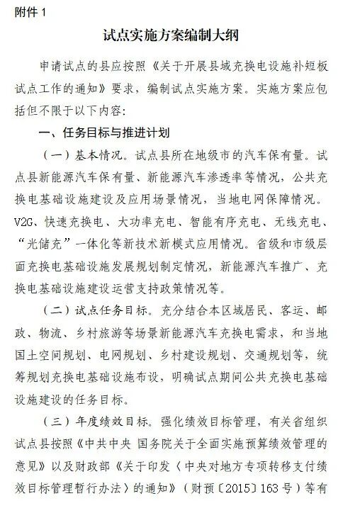 为贯彻落实党中央、国务院有关决策部署,根据《中共中央 国务院关于学习运用“千村示范、万村整治”工程经验有力有效推进乡村全面振兴的意见》有关精神,加快补齐农村地区公共充换电基础设施短板,进一步释放新能源汽车消费潜力,按照《国务院办公厅关于进一步构建高质量充电基础设施体系的指导意见》(国办发〔2023〕19号)有关要求,2024-2026年,财政部、工业和信息化部、交通运输部(以下简称三部门)将开展县域充换电设施补短板试点工作。现将有关事项通知如下: