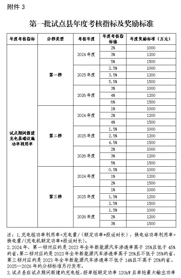中央财政对经三部门同意备案且完成任务目标的试点县给予奖励资金支持,每个试点县示范期为3年。奖励标准根据每年度试点县充换电设施功率利用率达标情况设置,共分为三个档次。示范期内,每年均达到最高目标的试点县最多可获得4500万元(具体年度考核指标及奖励标准见附件3)。