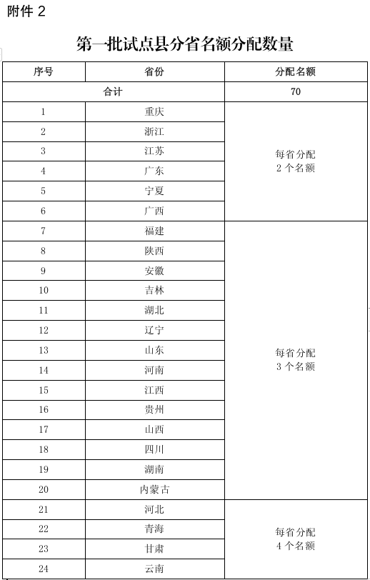 (三)名额分配。2024-2026年,三部门根据地方当前新能源汽车和公共充换电基础设施发展状况及未来潜力、地域面积、省内县(县级市)数量、当前财力状况等因素分配省级试点县名额(见附件2)。